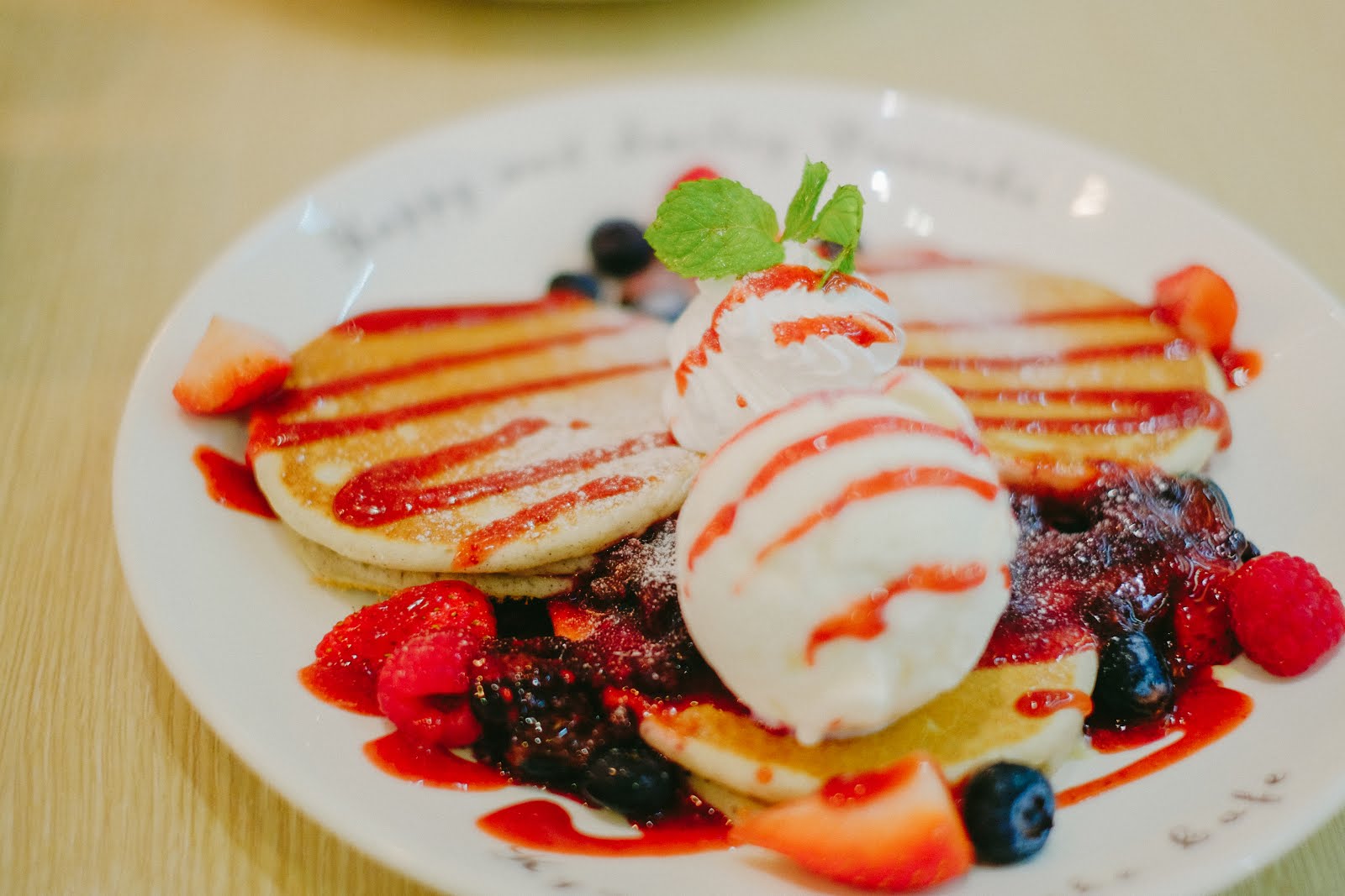 这款莓酱松饼 (Berry-Licious Pancake) 颜值也很高!草莓、蓝莓、树莓等丰富的莓果铺在松饼上,顶一个香草冰淇淋和一小坨新鲜奶油,再淋上卡仕达酱和莓果酱。最棒的是,即使冰淇淋融化了之后,这松饼也不会变得软趴趴的,依然保持了软弹蓬松的口感。